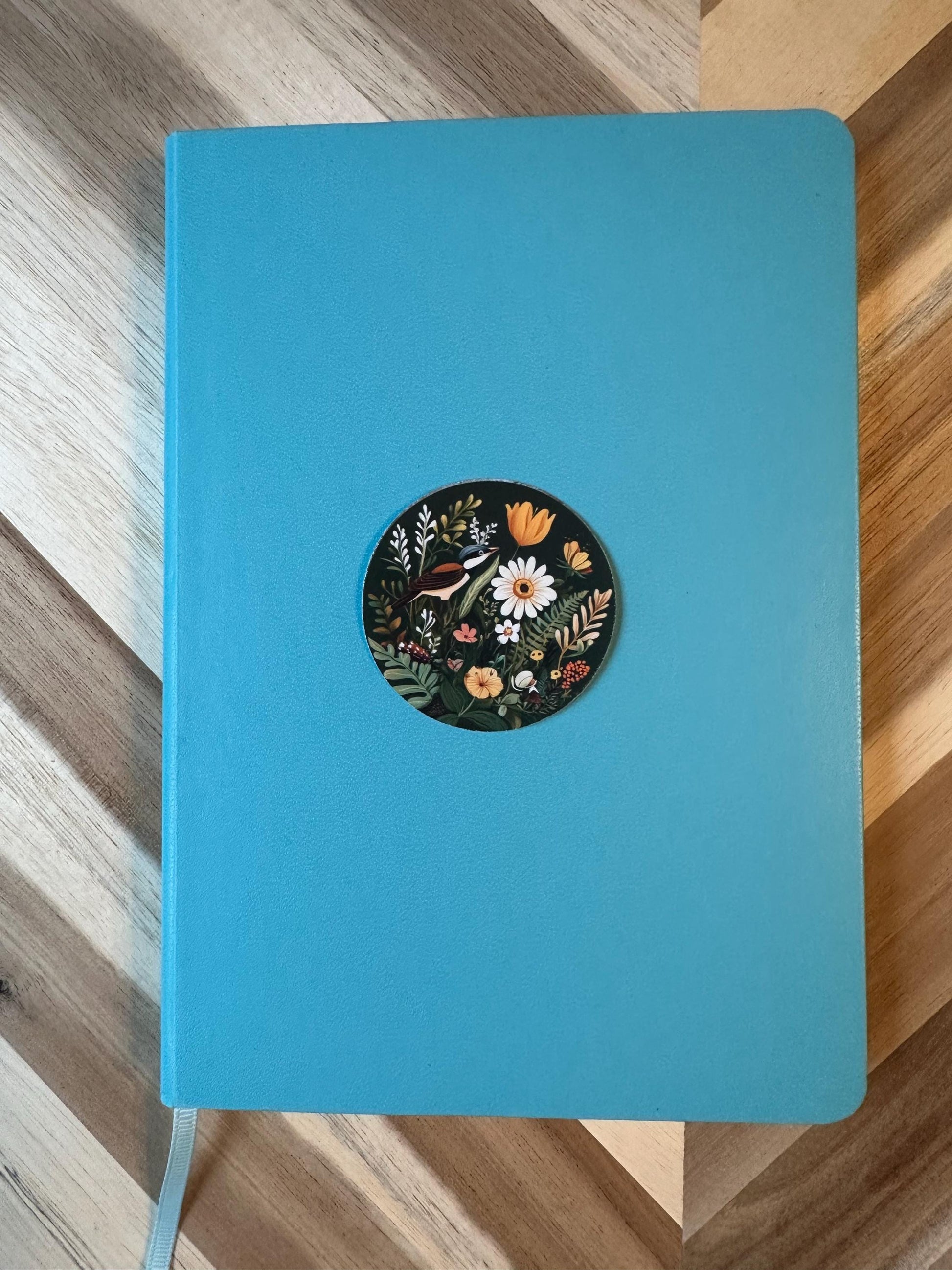 Bring the beauty of nature everywhere you go with this enchanting bird and wildflower sticker. Every detail has been carefully crafted to create a piece that feels both nostalgic and timeless. The circular format and striking black background make this sticker truly stand out in any collection.