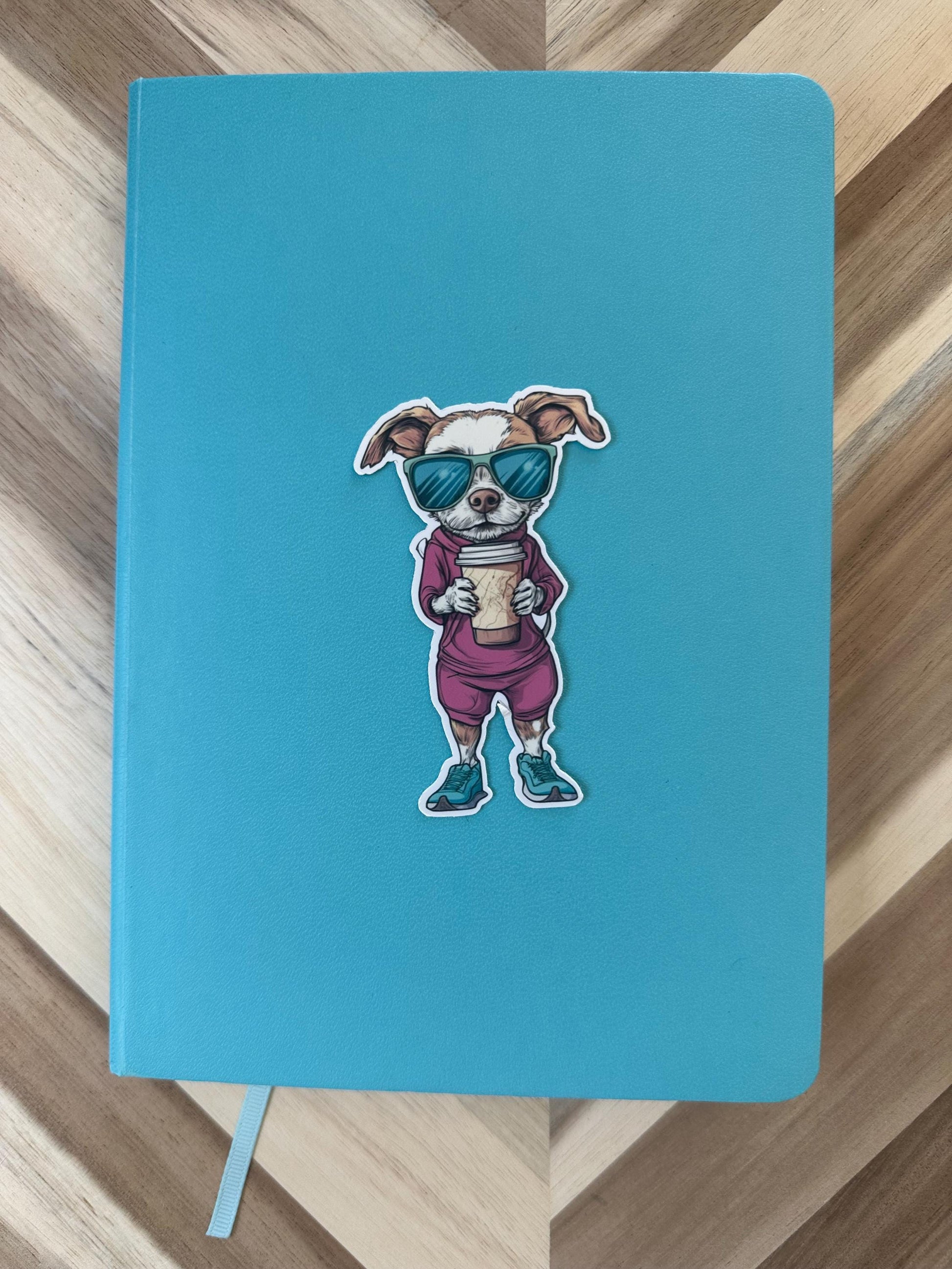 Perk up your day with this adorable coffee-loving dog vinyl sticker! This stylish pup is ready for morning walks with its trendy sunglasses, comfy pink tracksuit, teal sneakers, and essential coffee cup in paw. The perfect companion for any coffee enthusiast or dog lover!