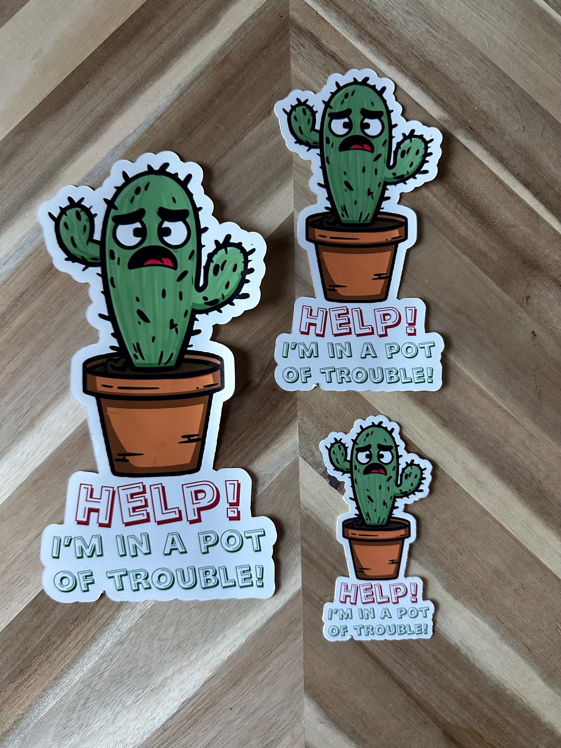 Funny Cactus Sticker: "Help I'm In A Pot Of Trouble" Vinyl Decal