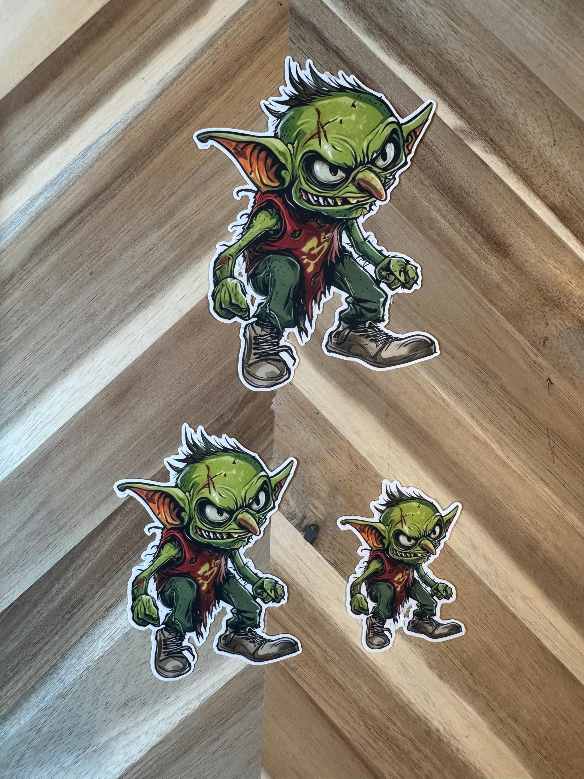Bring some mischievous charm to your belongings with this brilliantly detailed green goblin vinyl sticker! This character features a snarky expression, pointed ears, and a spiky mohawk, dressed in a tattered red vest and boots. The high-quality die-cut design comes with a clean white border that makes this little troublemaker pop on any surface.