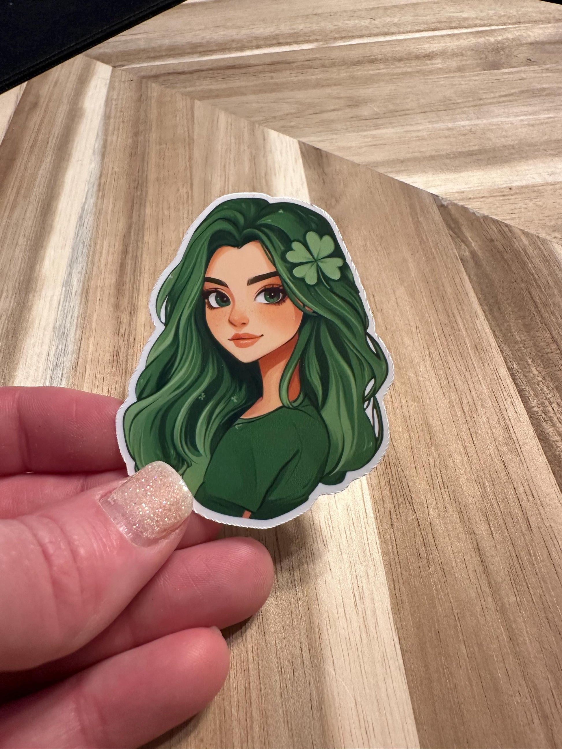 Add a touch of Irish charm to your collection with this beautiful Green-Haired Girl sticker! Featuring a stylish character with flowing emerald hair adorned with a lucky shamrock, this premium vinyl decal brings St. Patrick's Day spirit to your belongings all year round.
