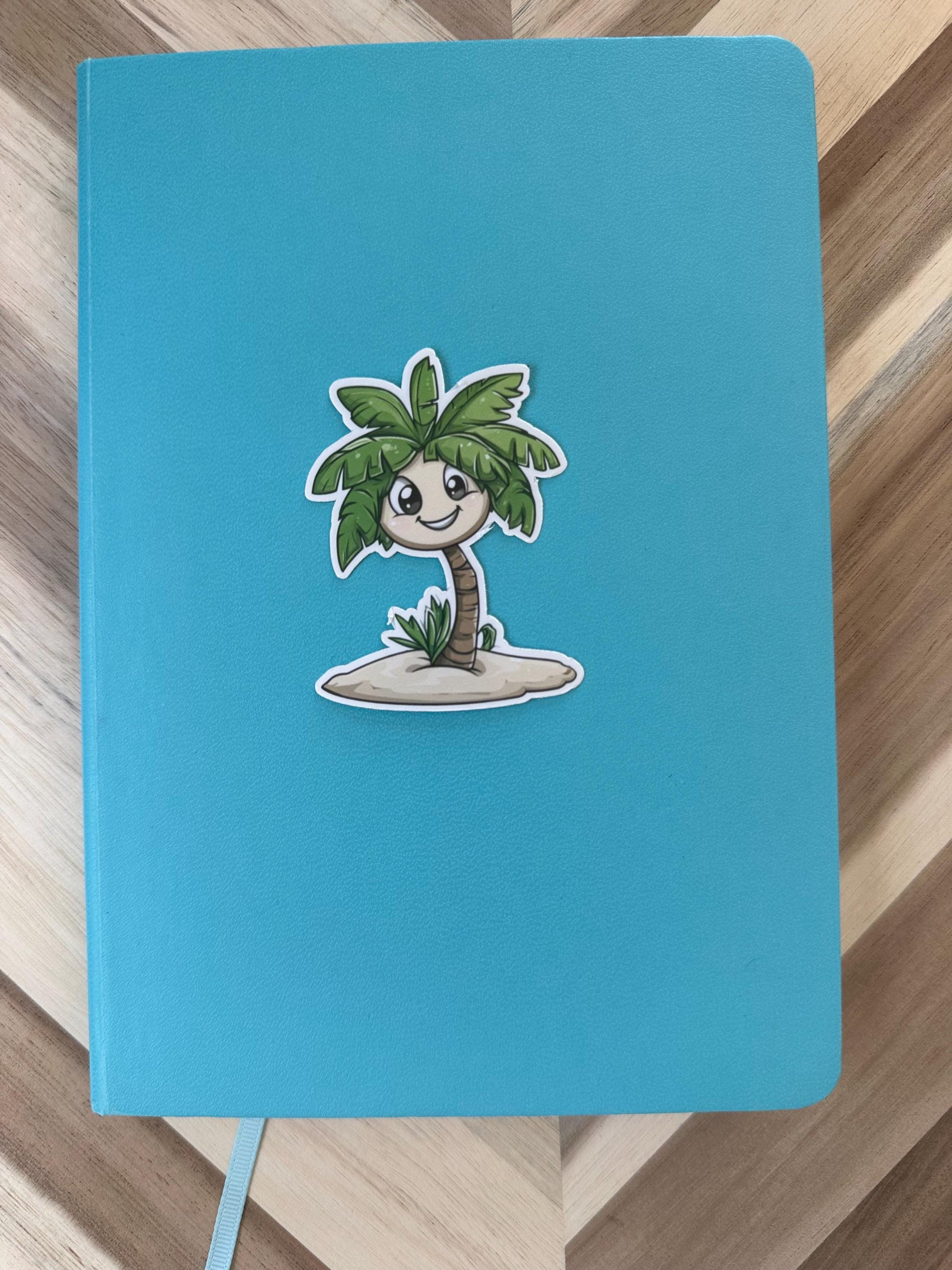 Bring tropical sunshine to your day with this adorable smiling palm tree vinyl sticker! This cheerful little island friend features a cute cartoon face, lush green fronds, and sits on its own mini sandy beach - the perfect way to add a touch of paradise to any surface!