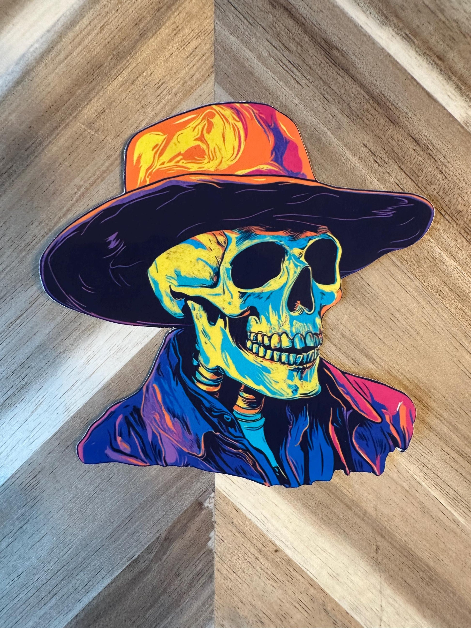 Neon Cowboy Skull Sticker | Psychedelic Western Skeleton Vinyl Decal | Colorful Day of the Dead Art