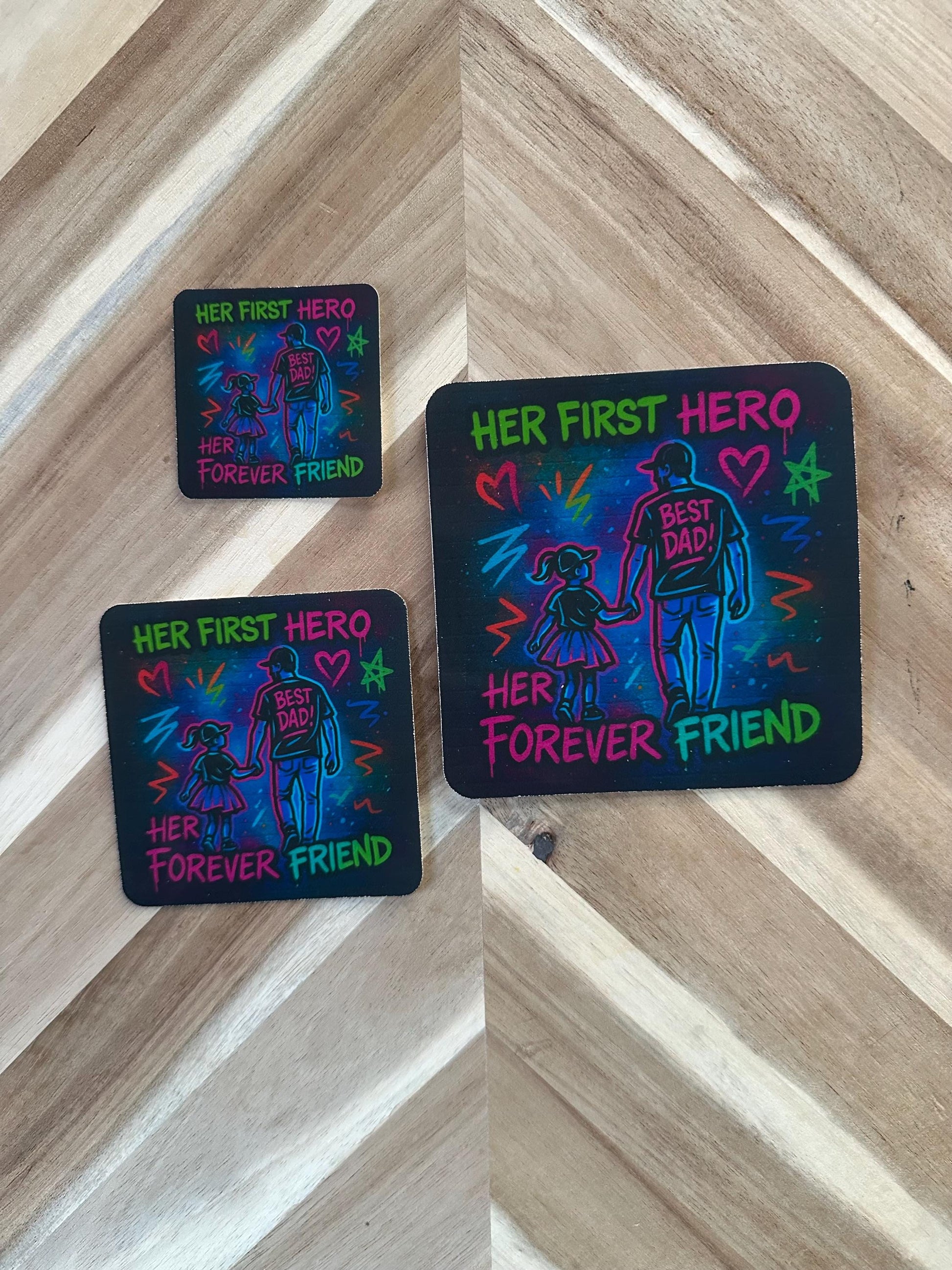 Light up any surface with this stunning neon-style sticker! "Her First Hero, Her Forever Friend" comes to life with vibrant electric colors and cosmic galaxy vibes. This eye-catching design celebrates the incredible bond between dads and their daughters with futuristic flair!