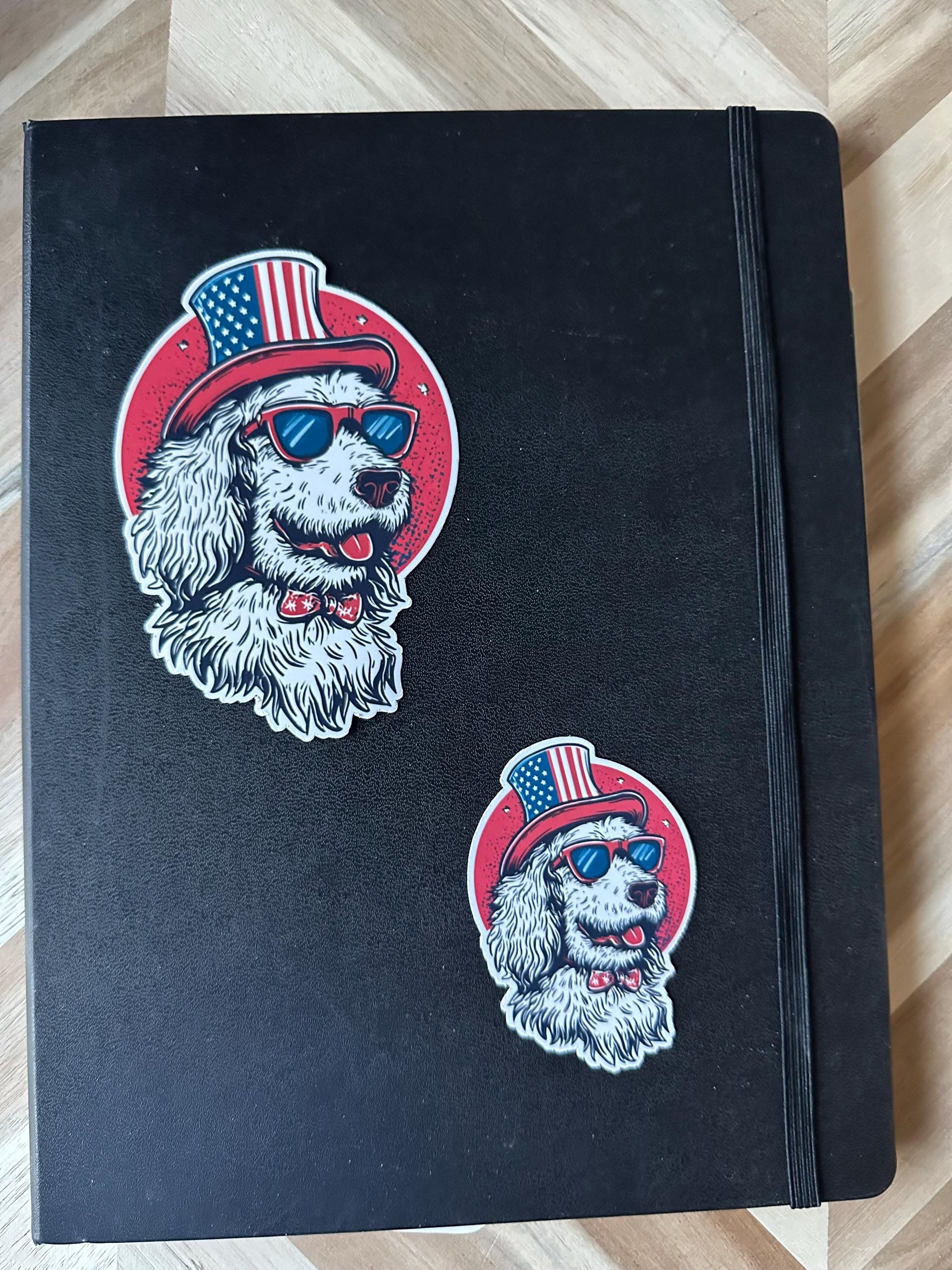 This fantastic vinyl sticker showcases a happy Doodle sporting the ultimate patriotic look! Complete with an iconic American flag top hat, stylish sunglasses, and a festive red bow tie with stars, this cheerful pup is ready to celebrate Independence Day in style. Set against a vibrant red circular background dotted with white stars, this design captures pure American spirit and dog joy!