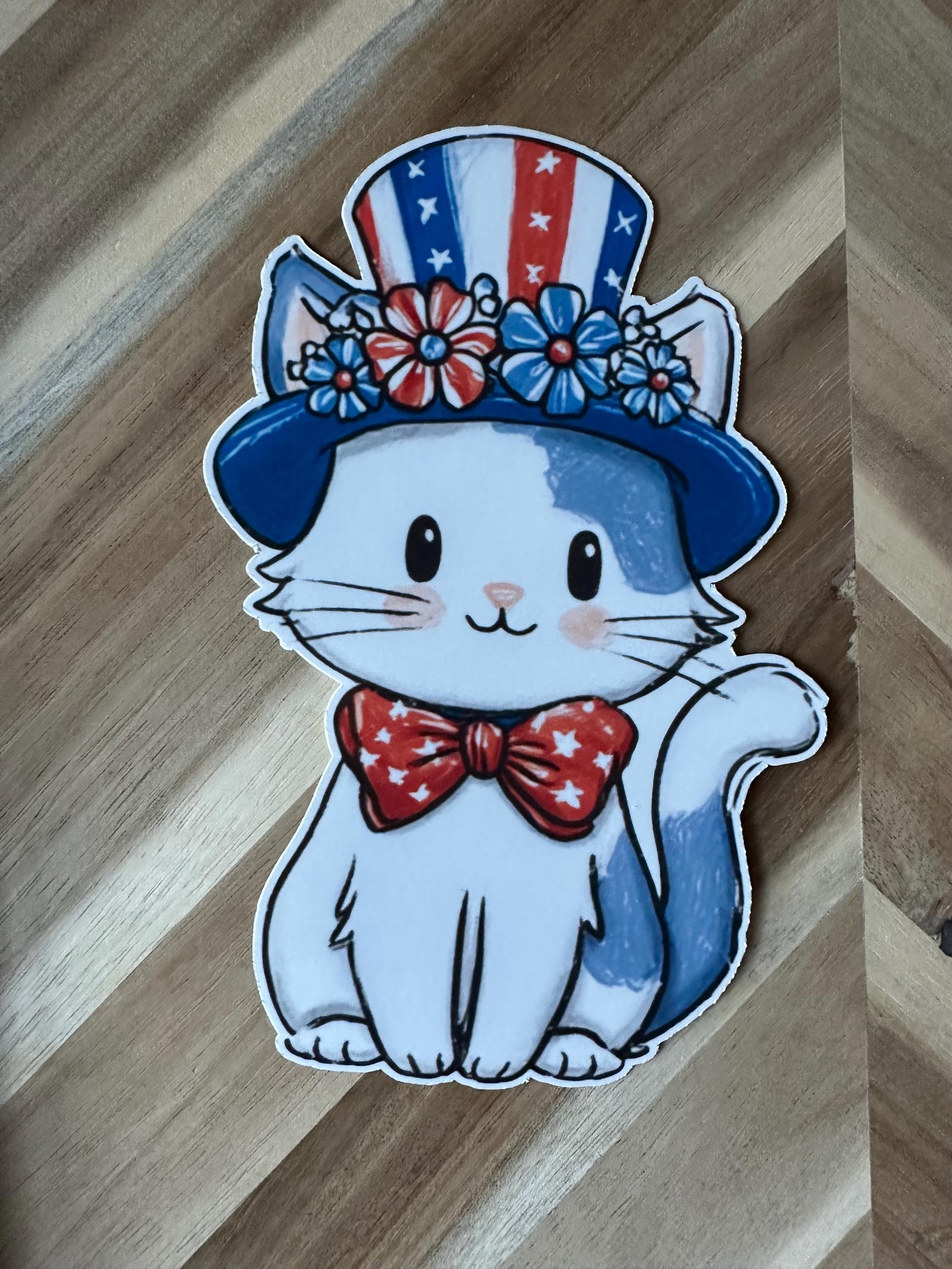 This absolutely precious vinyl sticker features an adorable kawaii-style white and blue cat celebrating Independence Day in the most charming way! Our sweet kitty wears a delightful Uncle Sam hat adorned with a beautiful flower crown featuring red, white, and blue blooms, plus a darling red bow tie decorated with white stars. With rosy cheeks and the sweetest expression, this little patriot combines feminine charm with American pride!