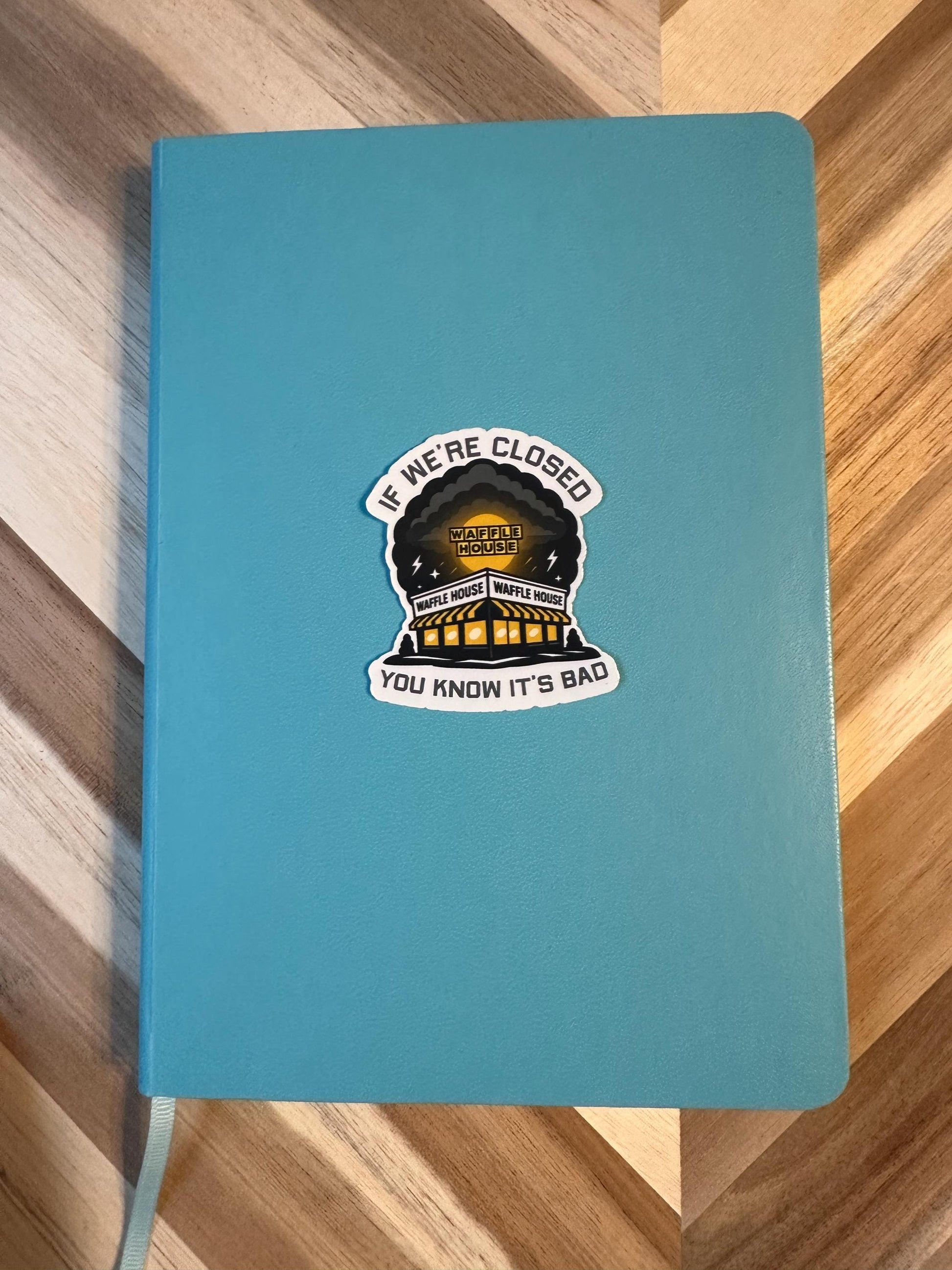 Make your water bottle, laptop, or car bumper disaster-ready with our exclusive "If We're Closed You Know It's Bad" Waffle House sticker! This high-quality vinyl decal celebrates the famous informal disaster metric used during severe weather events - when Waffle House closes, things are serious!